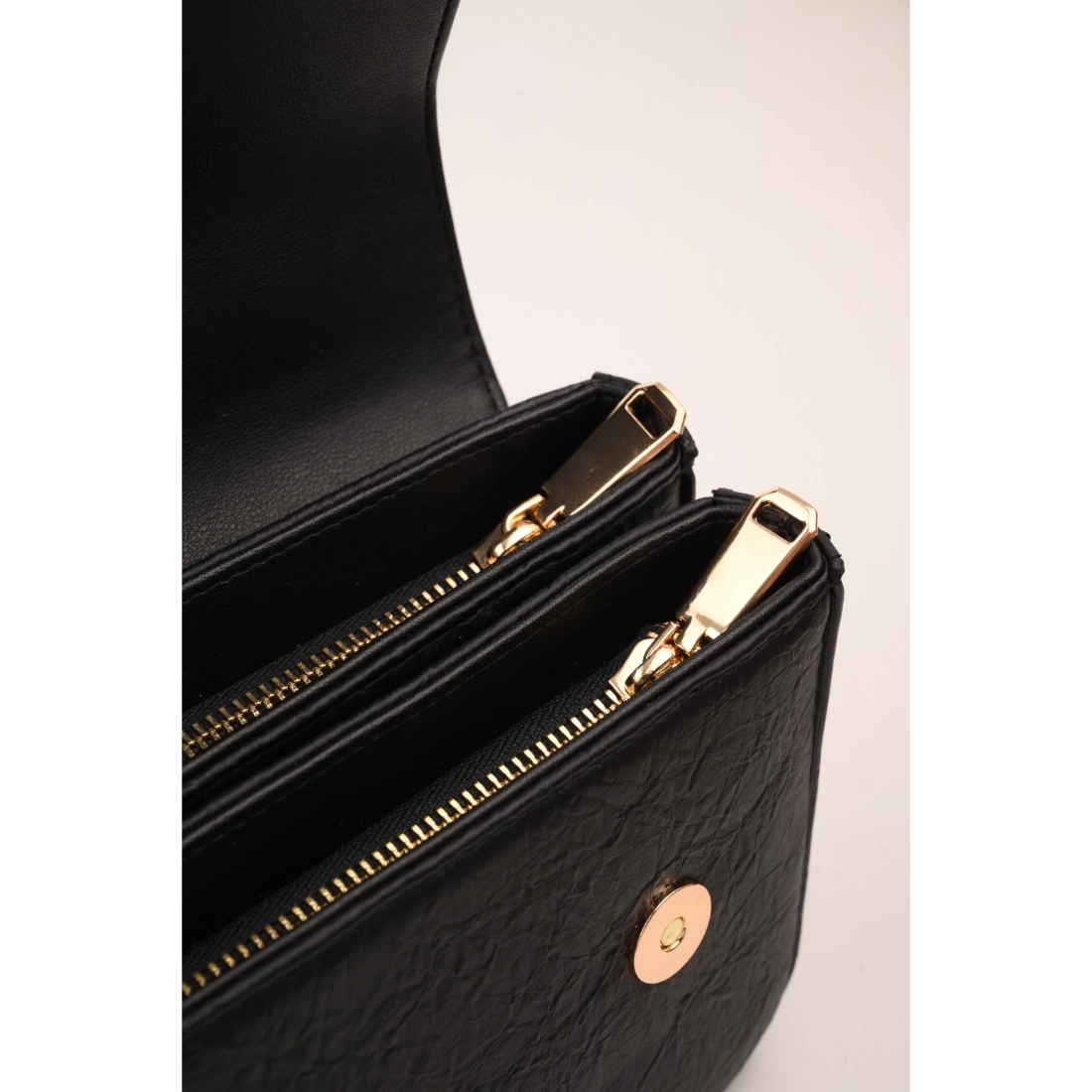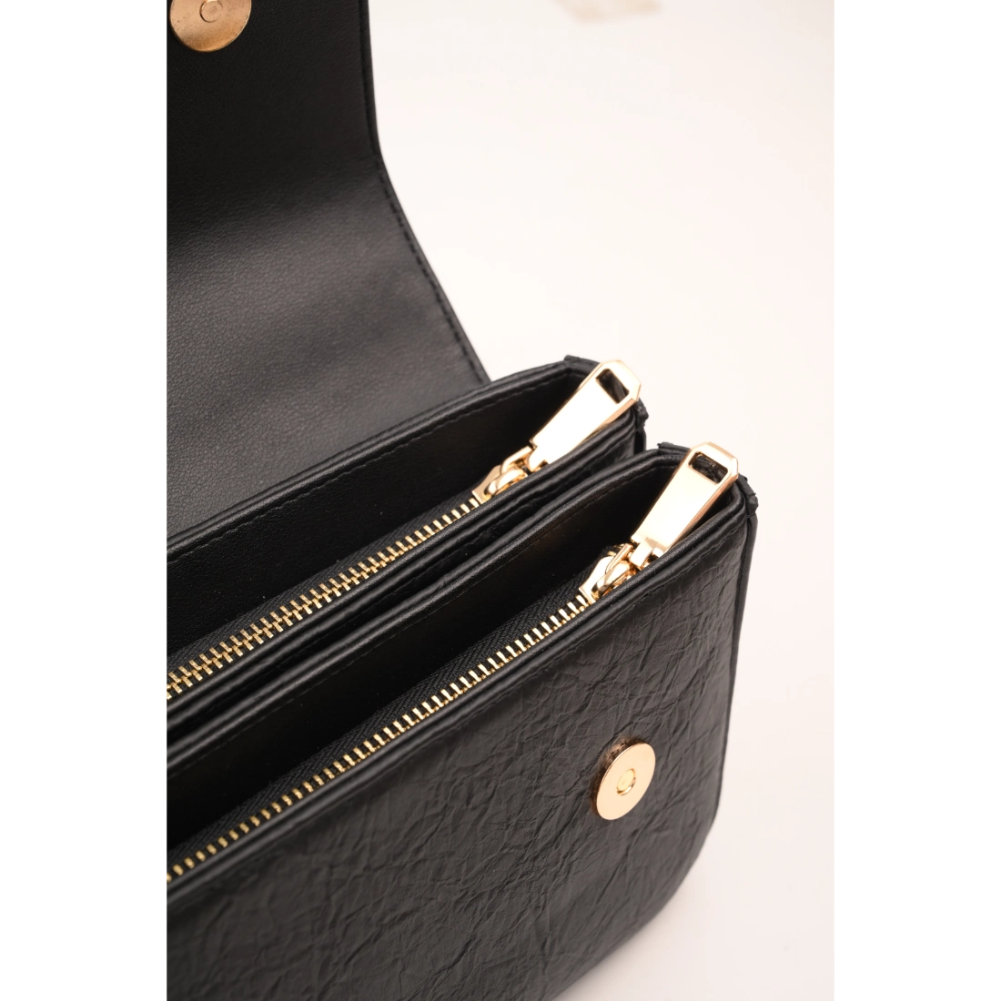 Elevate your style with the Classic Satchel, crafted from vegan, firm textured leather for a modern, sophisticated look. Its rectangular silhouette (13x22x7cm) offers ample space while maintaining a sleek profile. Gold-plated details on the handles and logo add a touch of luxury, making it perfect for both workdays and special occasions. A stylish, cruelty-free accessory that combines elegance with practicality.